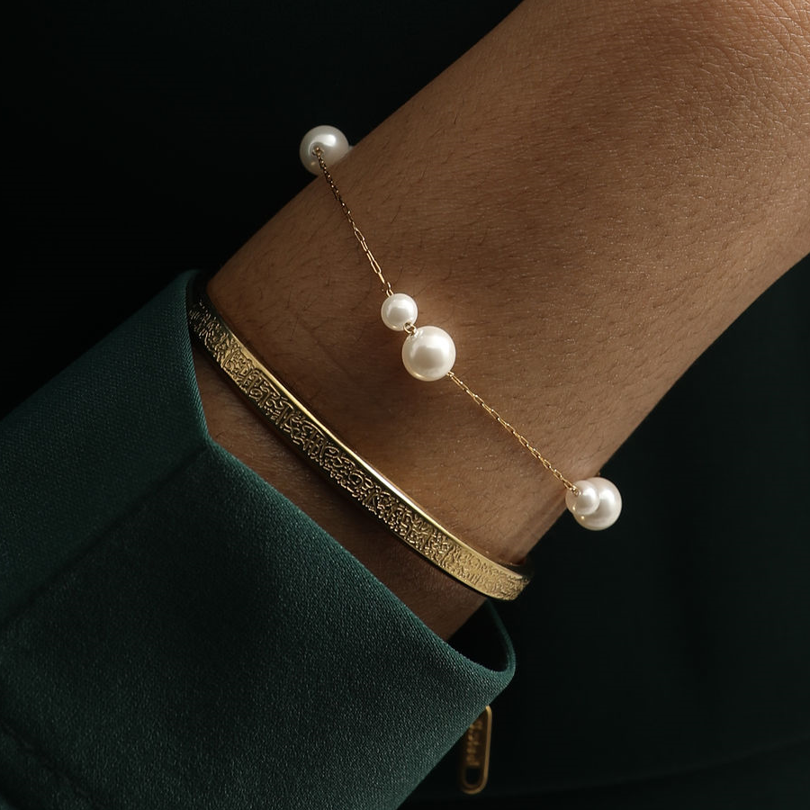 This elegant pearl bracelet features a stunning combination of two pearls—one small and one large—beautifully spaced along a delicate gold-plated chain. The contrast between the sizes of the pearls creates a sophisticated, modern look. Perfect for adding a touch of refinement to any outfit.