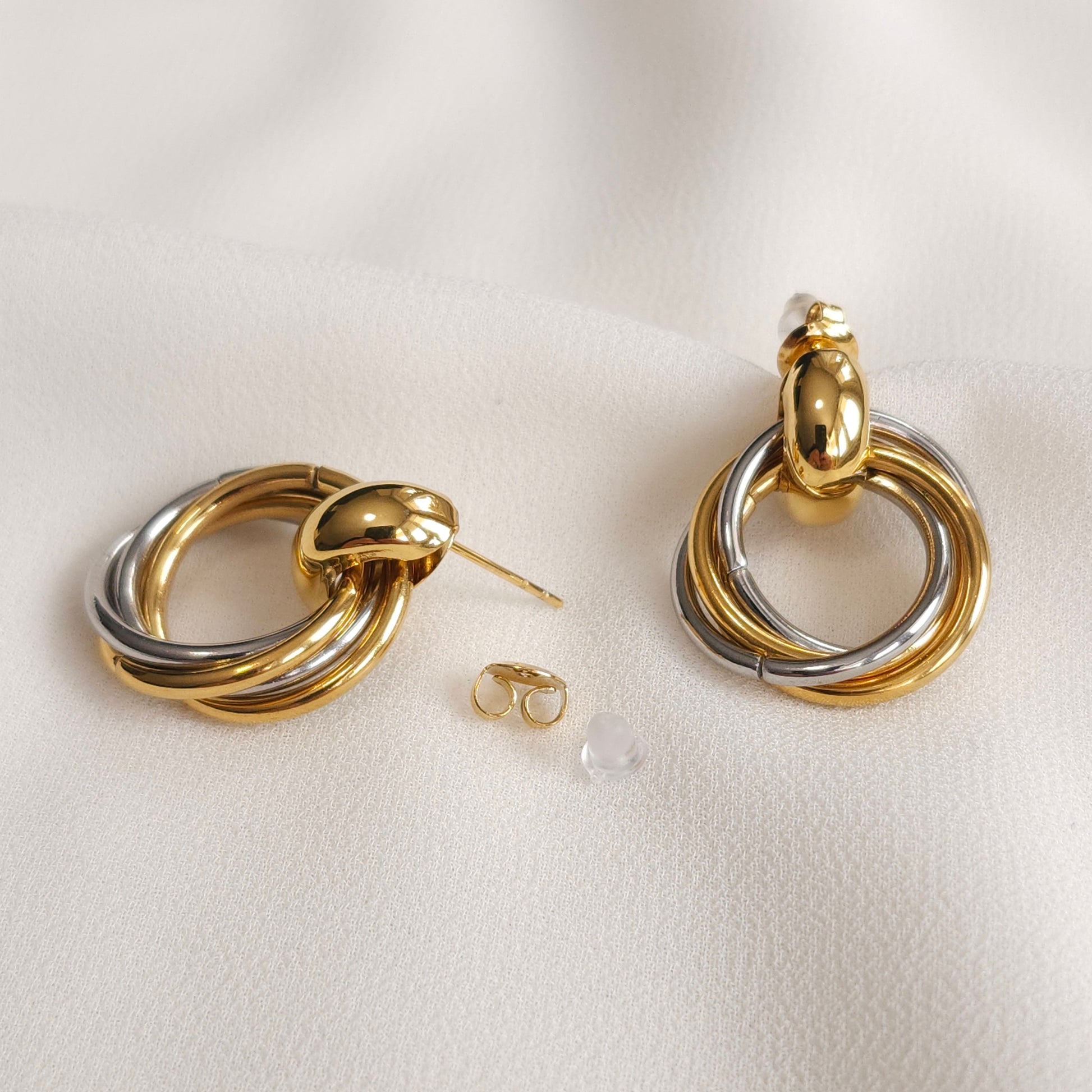 These modern mixed-metal earrings feature interlocking gold and silver-tone hoops for a bold yet timeless look. Designed to catch the light from every angle, they add instant polish to both casual and dressy outfits. Crafted from durable, waterproof stainless steel, they’re hypoallergenic and made for all-day comfort. A statement pair that blends elegance with contemporary edge.