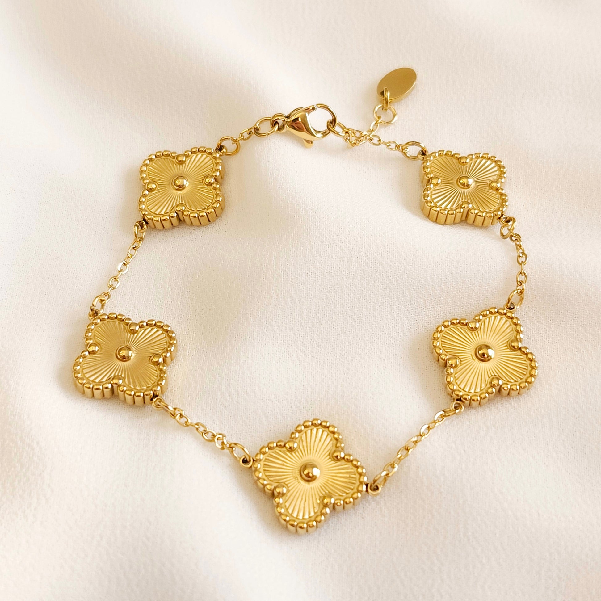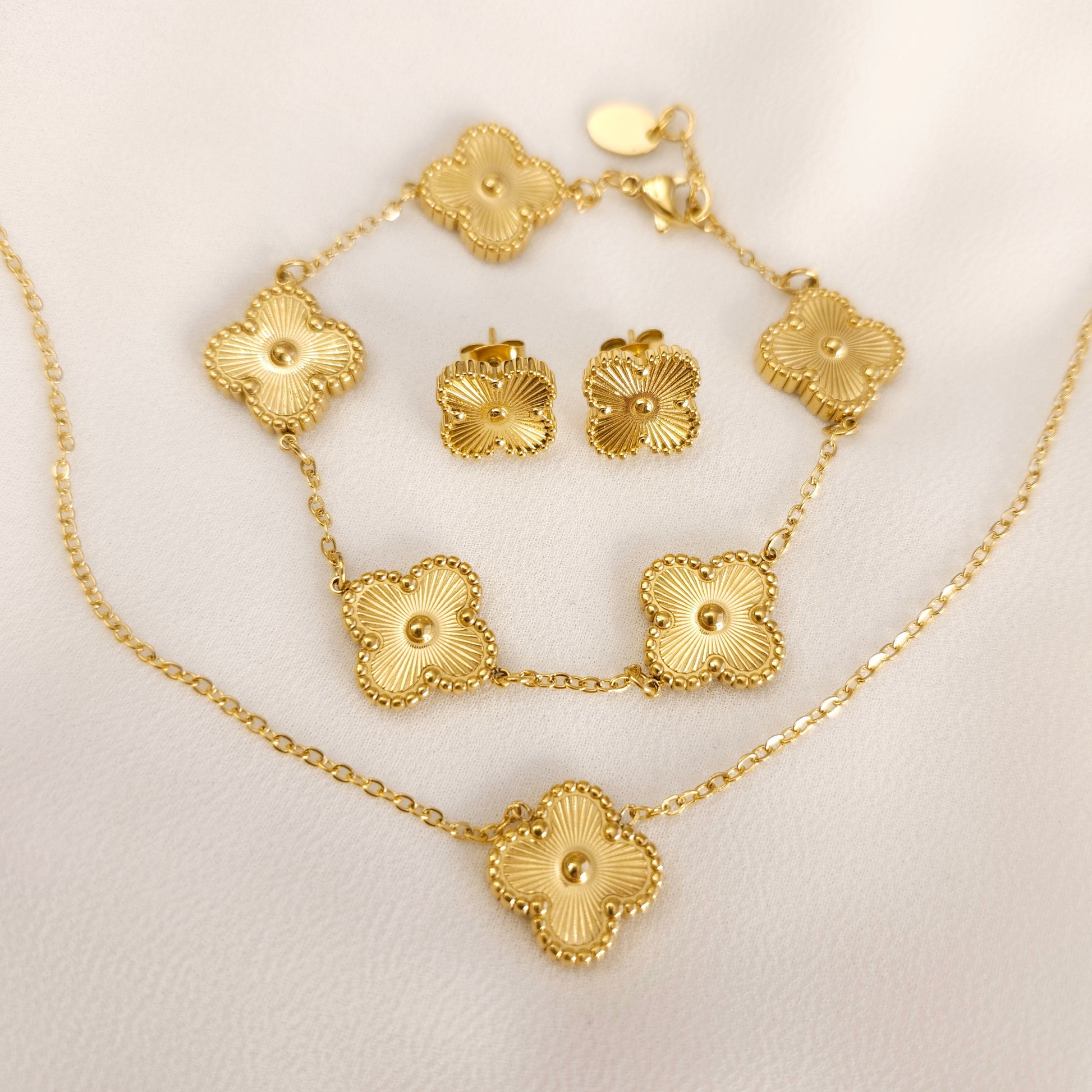 This elegant jewelry set includes a bracelet, earrings, and necklace, all crafted from high-quality gold-plated stainless steel for a durable, luxurious finish. The timeless clover design is enhanced with a delicate starburst engraving at the center of each piece, adding a touch of sparkle and sophistication. Perfect for any occasion, this set offers both classic charm and modern flair, making it a versatile addition to your jewelry collection. Whether dressing up for a night out or adding a subtle touch of elegance to everyday wear, this set is sure to elevate your style.