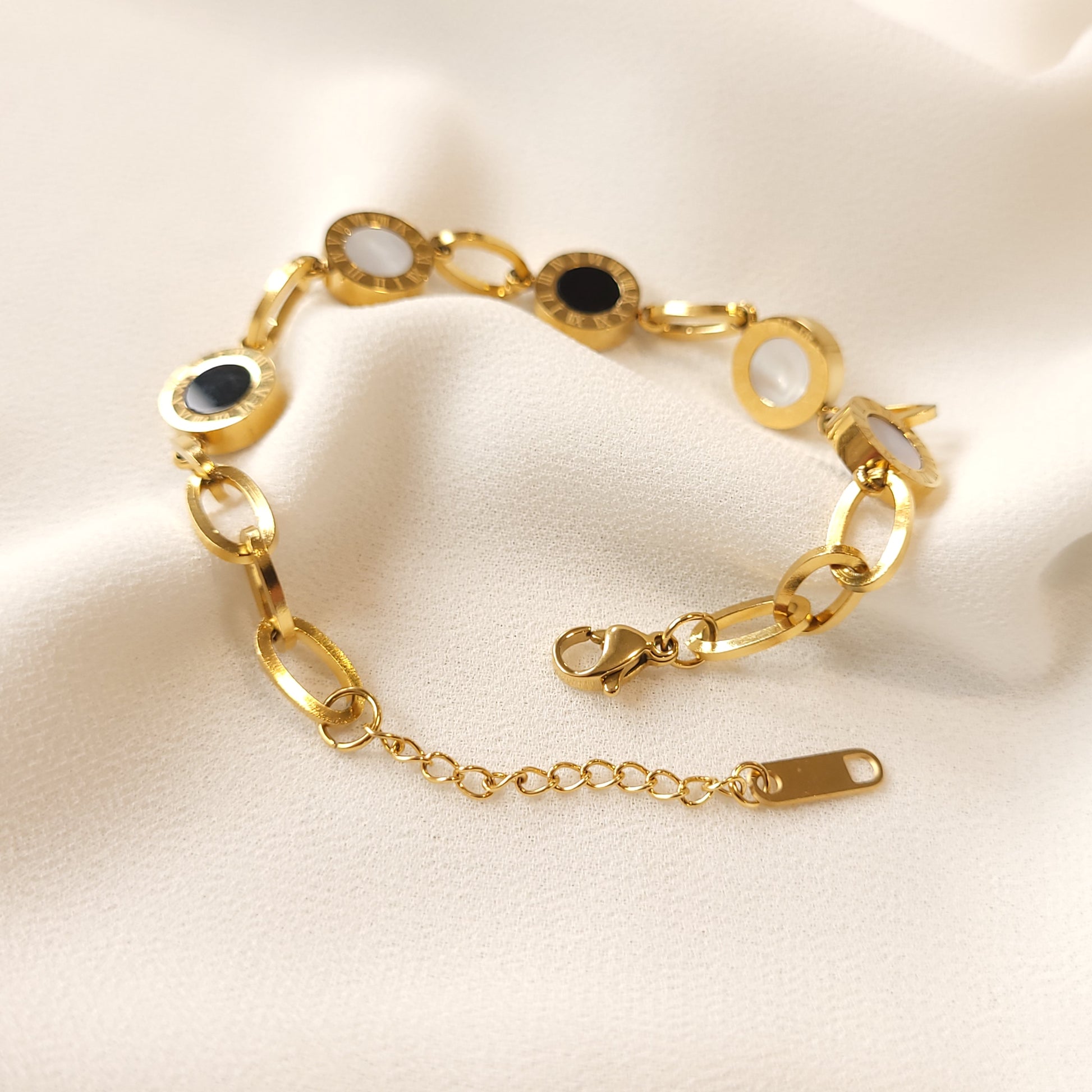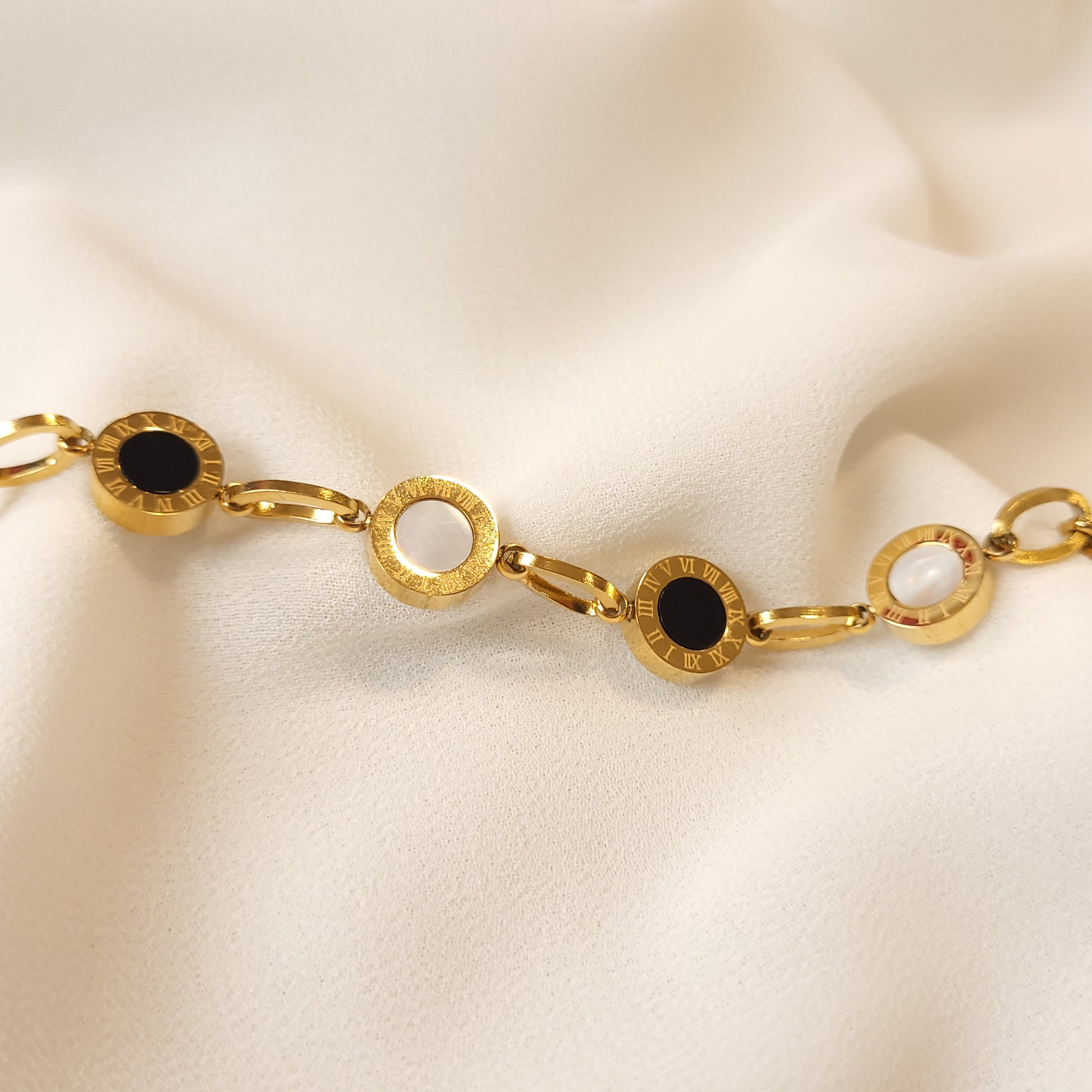 Indulge in classic charm with our link bracelet, featuring alternating white and black enamel charms exquisitely accented by delicately engraved Roman numerals. The epitome of timeless style, this bracelet seamlessly combines sophistication and grace, making it a stunning addition to any outfit. Elevate your wrist with this captivating piece that exudes elegance and refinement.